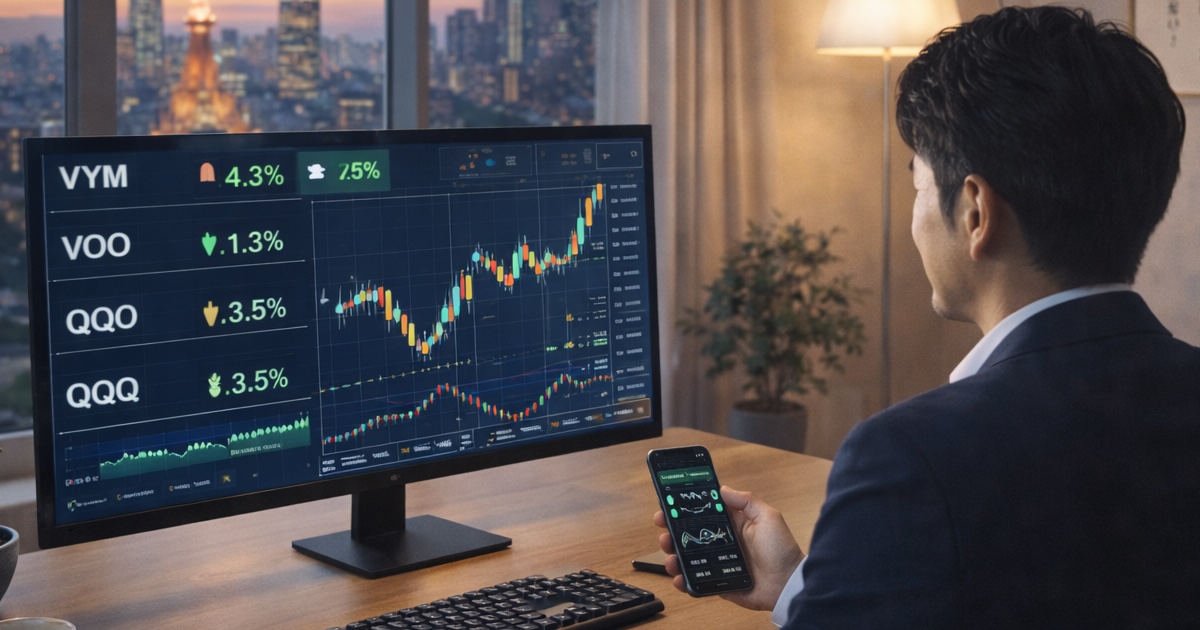海外ETFとは、簡単に言えば「株式市場で売買できる投資信託」のようなものです。VOO(S&P500連動)、VYM(高配当株)、QQQ(ハイテク株)などが代表的です。